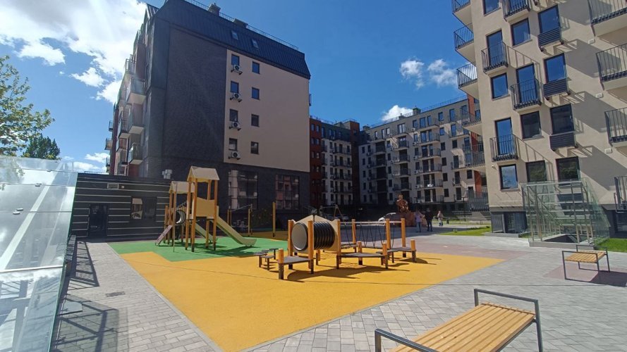 Двор без машин, современная детская спортивная площадка, безопасный двор и дом с видеонаблюдением, подземный паркинг, кладовые.