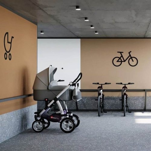 На первых этажах комплекса в подъездах предусмотрены колясочные комнаты. Это позволит жителям организовать хранение детского и спортивного инвентаря. После прогулок с младенцем коляску не обязательно поднимать в квартиру — хранить её можно в закрытой колясочной.